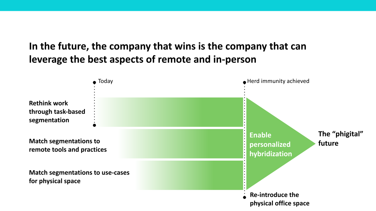 Our final recommendation was to introduce a task-based segmentation model. This would enable Humana to create personalized hybrid work options rather than applying a one-size-fits-all rule, equipping the company to thrive in what we call the "phigital" future.